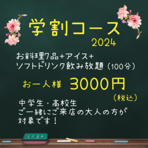 学割コース】のお知らせです📢中学生•高校生(小学生も可)の方とご一緒にご来店の大人(保護者•先生)の方対象のお得なコースです♪お一人様3000円(税込)◆お料理7品+アイス①シーザーサラダ②生春巻きor一品料理③鶏の唐揚 […]
